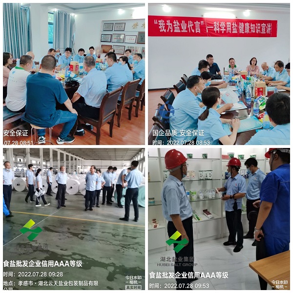 此次交流活動是繼5月底開展的“我為鹽業(yè)代言”聯(lián)合支部主題黨日活動后的一次回訪。云夢分公司經理范雙平首先介紹了云夢分公司的發(fā)展歷史和目前經營業(yè)務開展情況;湖北鹽業(yè)集團有限公司孝感分公司(以下簡稱“孝感分公司”)黨辦主任丁文英重點介紹了當前熱推的云鶴牌弱堿食用鹽和雪砂牌白糖等產品的性能、特點;孝感分公司市場部部長彭潔簡要介紹了大包裝食用鹽和工業(yè)鹽產品。隨后,孝感儲備庫經理盧繼學談到了此行的目的,希望雙方借此機會進一步增進了解,共拓渠道做強業(yè)務鏈,推進品牌效應最大化。接著,大家冒雨驅車到湖北云天鹽業(yè)包裝制品有限公司和湖北藍天鹽化有限公司生產車間進行了參觀。